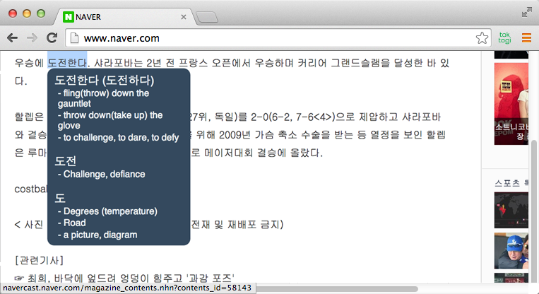 - Uses 'kengdic', an open source Korean-English dictionary developed by Joe Spiegle